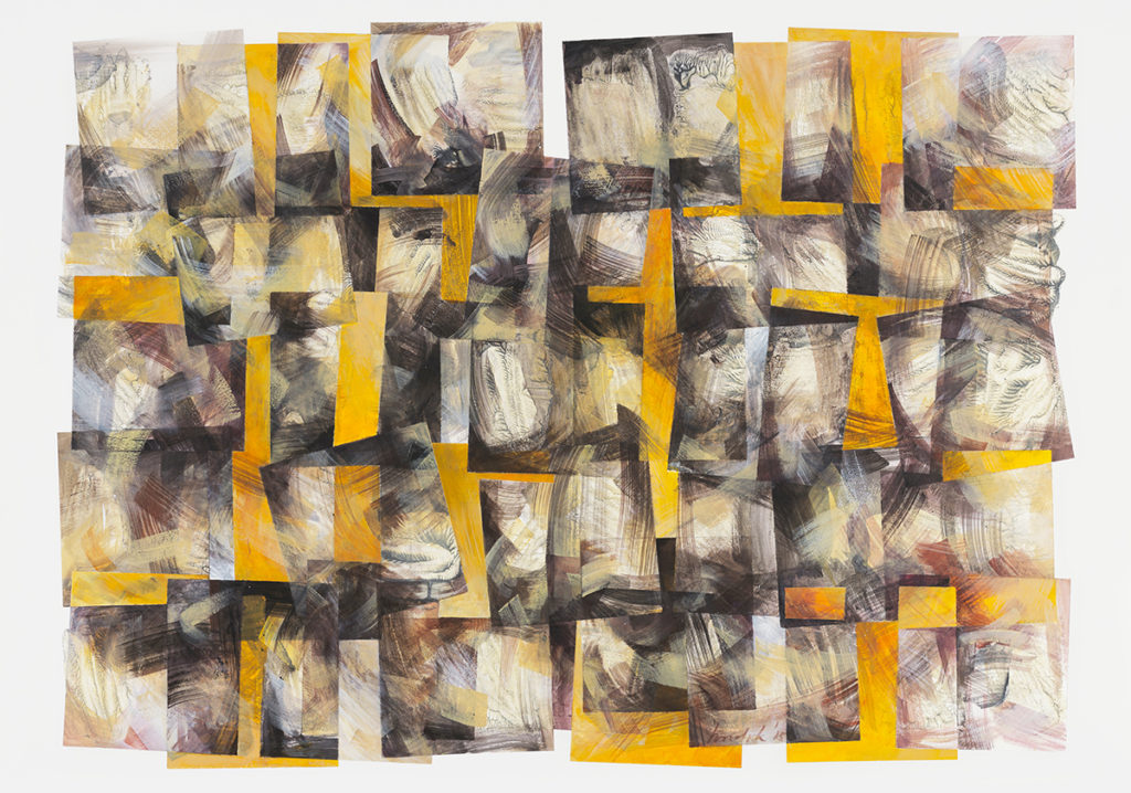 Gaandeweg is Hendriks manier van schilderen fundamenteler geworden. Door te onderzoeken wat je puur met de kwaststreek kunt uitdrukken, ontdekte hij de waarde van ‘visuele muziek’ (in de jaren ’80 waren seriële componisten als Glass en Reich een onderhuidse invloed). Ook in dit lyrische spel met de kwast doken nog figuratieve elementen op. Uiteindelijk koos hij rond 2015 voor een harde mathematische vorm (vierkant en kubus) om het duel aan te gaan met de losbandige kwaststreek. Deze werken stelt hij in Galerie 44 ten toon. Toch viel het Hendrik nog niet zo lang geleden op dat de kubusvorm al in zijn vroegste studententijd een rol speelde, wat hem gerust stelt. Zijn werk komt voort uit een ononderbroken stroom.