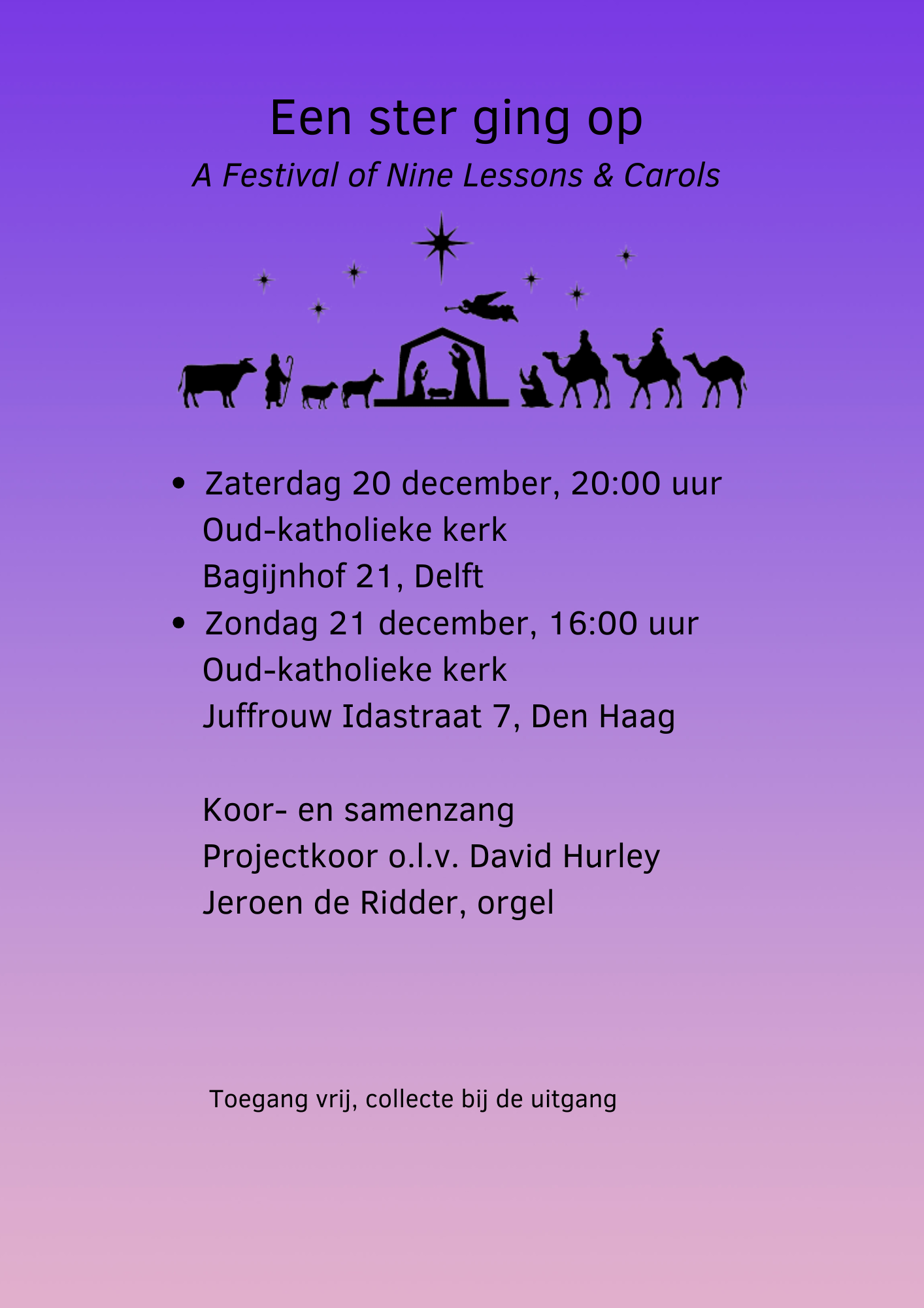 “A Festival of Nine Lessons and Carols” is een uit Engeland bekende en geliefde traditie, maar is inmiddels ook al jaren een traditie in Den Haag. In het weekend voor kerst houden we een bijzondere viering waarin lezingen en (kerst)liederen elkaar afwisselen. De negen lezingen, genomen uit het oude testament en de evangeliën, vertellen het verhaal van de belofte en de komst van de Messias. De lezingen worden afgewisseld met koor- en samenzang.