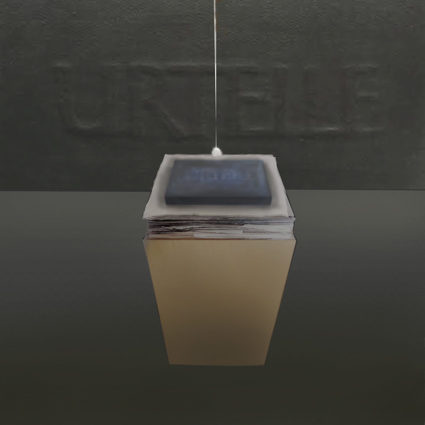 “Urteile is te zien in het venster van Galerie 44 in de Molenstraat. Ik heb kranten opgestapeld, ongeveer 80 centimeter hoog. Daar ligt een zwaar blok op, met een lampje erboven, en aan de achterkant hangt een gouden behang met het woord: Urteile.